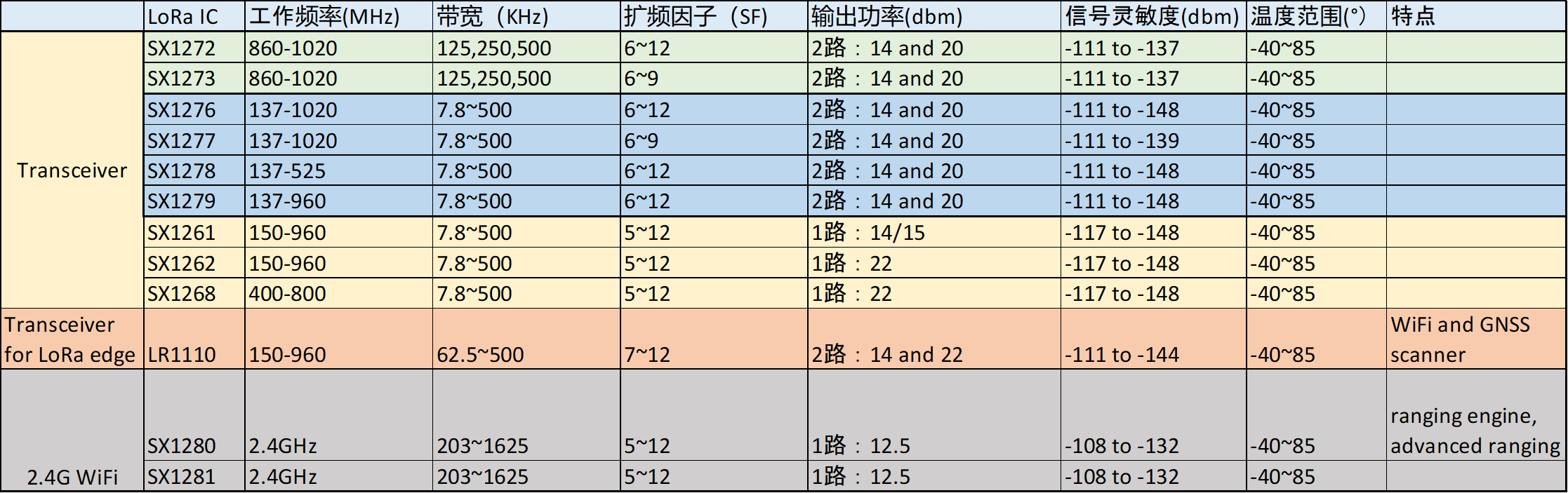 LoRa 作为Semtec公司的主要产品,它的芯片有很多不同的型号。总的来说产品线比较全,由做node的芯片,也由作为gateway的芯片。对于不同带宽,不同功率,不同SF的需求,下面列出了Semtech 公司的主要的一些收发器,同时对他们的主要的性能指标进行了总结。