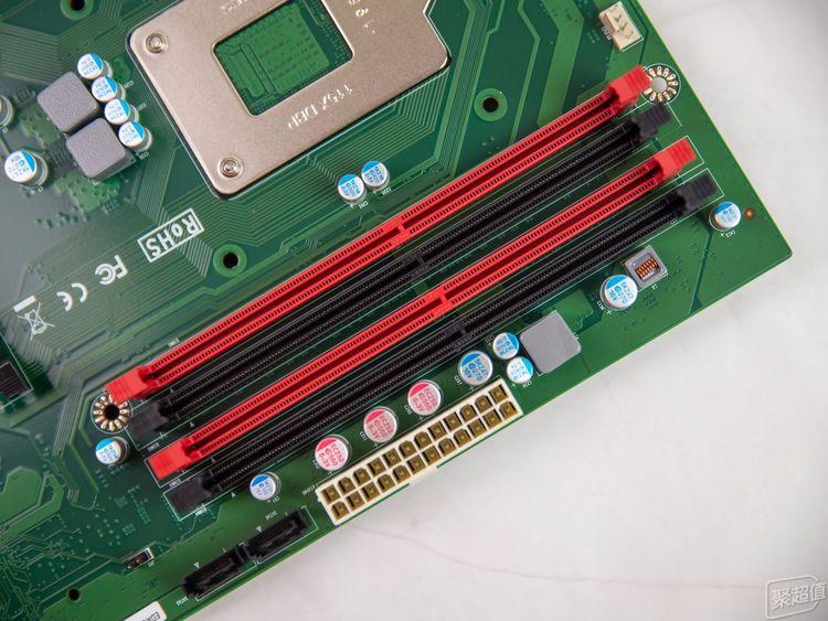 主板的供电插槽是标准24Pin插槽,在供电口的左侧设计有2个SATA接口,内存插槽则配备有4条 DDR4 DIMM,最大支持64G DDR4内存。