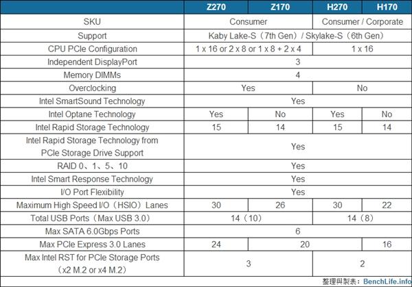 只有Z270、H270之间的不同,和以往的Zx7、Hx7之间差不多,还是CPU PCI-E通道配置、超频、USB 3.0、RST PCI-E通道等方面有所差异。