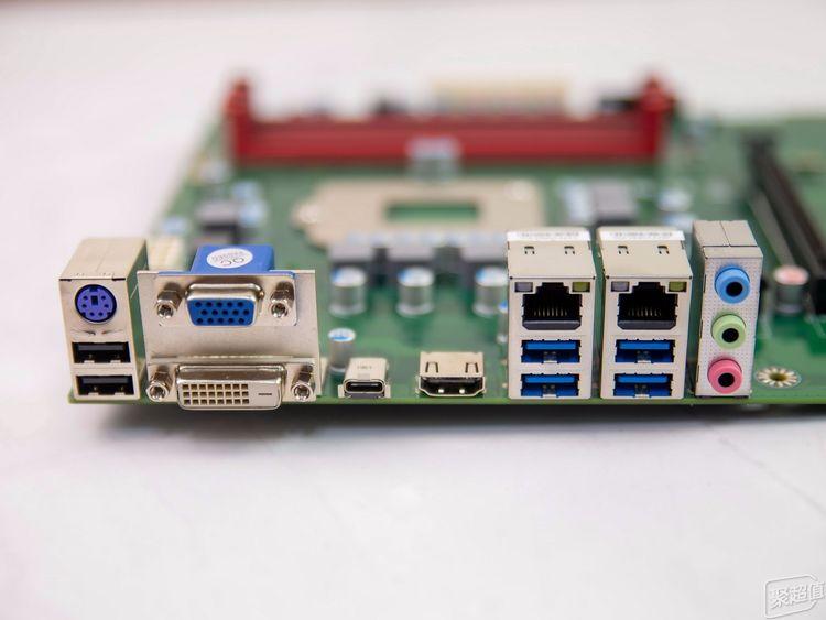 益德EDAC-Q270双极主板的接口非常齐全。接口从左到右从上到下分别是:键鼠二合一PS2接口,2个USB2.0接口,VGA,DVI-D,Type-C,HDMI,RJ45网口,2个UB3.0接口,RJ45网口,2个USB3.0接口,音频接口。
