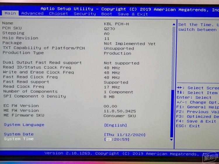 通电后,一次点亮。按照惯例,先进CMOS看看,结果发现不是UEFI的界面,而是老式的BIOS。由于没有截图功能,屏幕拍起来摩尔纹比较明显,所以这方我也不准备介绍了。可以设置的选项非常多,应该是我见过的最多的一款了。