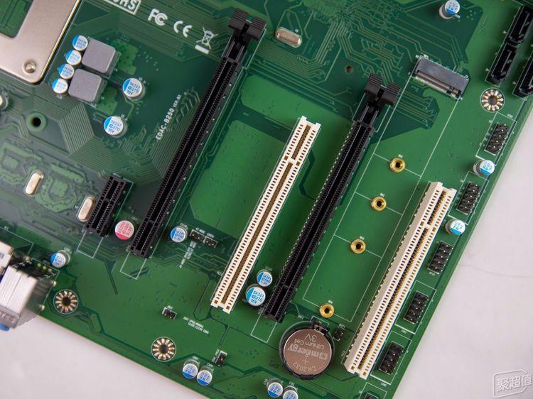 益德EDAC-Q270双极主板的PCI扩展槽也很丰富,从左到右分别是PCI-E x1,PCI-E 3.0 X16,PCI,PCI-E 3.0 X16,PCI。目前PCI比较少见了,还可以接一些声卡,debug卡等配件。