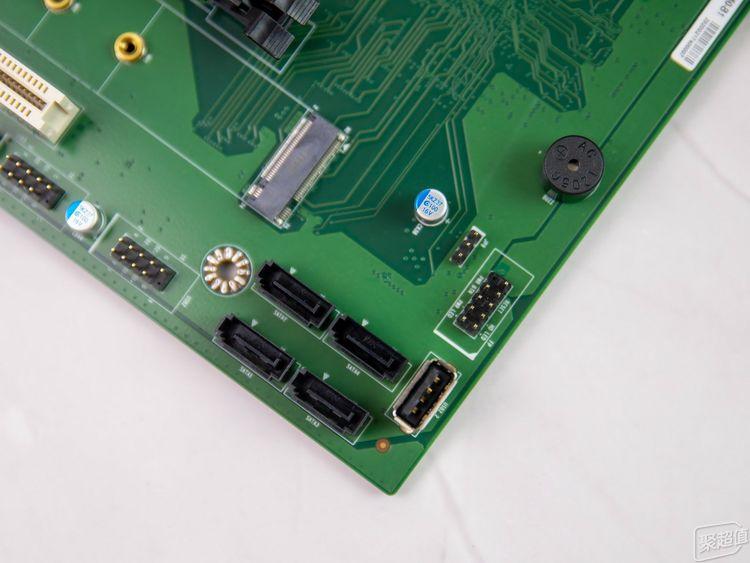 在主板的右下角,还设计有4个SATA接口,这里还预留了个USB接口,在USB接口的上方,是前置开关接口的连接插座。再往上一点,就可以看到蜂鸣器,这个可是非常实用的东西,有问题可以通过蜂鸣器的警报声来判断分辨,这样解决问题的效率就会有所提高。