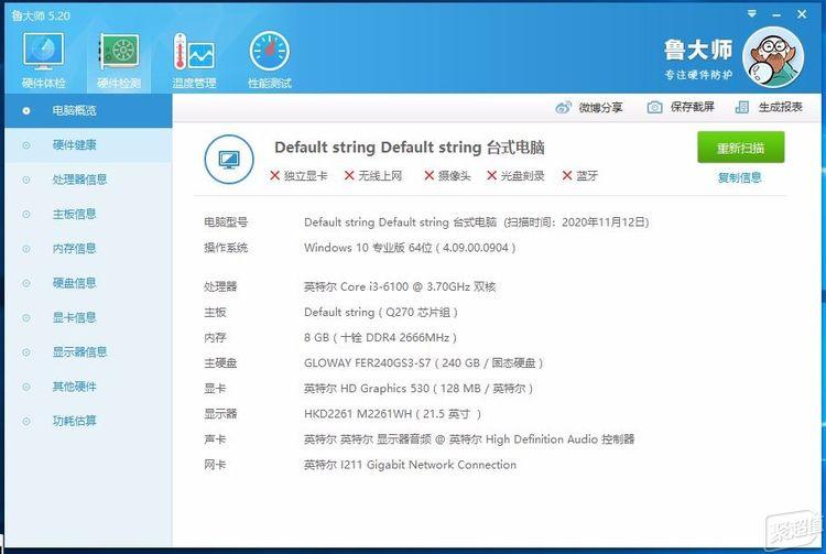 然后来个鲁大师检测一番。主板也是显示Q270芯片组。