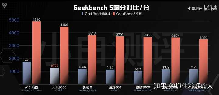 单核以及多核跑分方面,天玑9000超过了骁龙8Gen 1,与满血的A15性能差距小了很多。