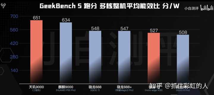 天玑9000这次能效比达到了651,超过麒麟9000处理器,领先骁龙8Gen 1达到了100多分。