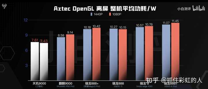 平均功耗,天玑9000仅有7左右,比骁龙8gen 1低了快3瓦,差距明显。