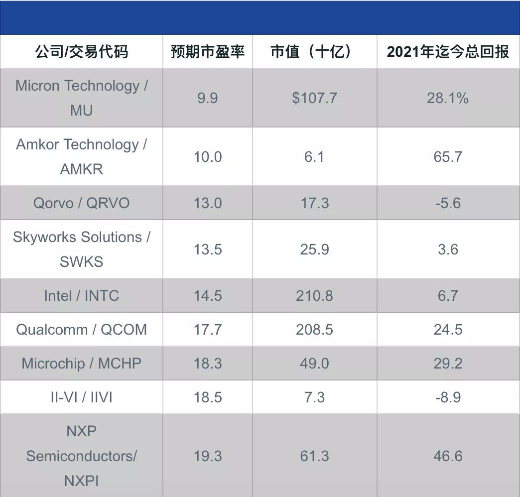 虽然全球芯片需求前景仍不确定,但这些便宜的芯片股仍有望上涨。从汽车到电冰箱再到电子游戏机等制造商都受到了“缺芯”的影响,投资者也一直在追捧芯片股。 2021年芯片股大幅上涨,随着供应链短缺问题有望得到缓解,明年全球对芯片的旺盛需求可能会减弱,为投资者带来一个寻找便宜股的机会。今年迄今,费城半导体指数(PHLX Semiconductor Index,SOX)上涨了43%,轻松超过纳斯达克综合指数23%的涨幅。费城半导体指数目前市盈率为7.9倍,是10年历史平均水平的两倍多。 《巴伦周刊》根据基于2022年预期盈利的市盈率,从费城半导体指数30只股票中筛选了一些最便宜的股票。 内存芯片公司美光科技(MU)是最便宜的芯片股,市盈率为9.9倍。12月20日,该公司公布了强劲的业绩,并发布了好于市场预期的业绩指引。美光科技近期股价为94美元,今年以来的回报率为28%。芯片产品封装和测试服务提供商Amkor Technology (AMKR)的市盈率为10倍,近期股价约为24美元,这只中盘芯片股2021年的回报率为65%。苹果(AAPL)的供应商Qorvo (QRVO)和Skyworks Solutions (SWKS)的市盈率分别为13倍和13.5倍。这两家公司的股价都低于同类公司,Qorvo近期股价为157美元,2021年下跌了6%,Skyworks近期股价为156美元,今年上涨了3%。 曾是芯片行业霸主的英特尔(INTC)近期股价为52美元,今年上涨了4%。《巴伦周刊》在2020年11月的封面报道中称,英特尔已经到了东山再起的时候。但伯恩斯坦(Bernstein)分析师斯泰西·拉斯贡(Stacy Rasgon)认为,英特尔的股票虽然便宜,但不一定有吸引力。英特尔首席执行官帕特·盖尔辛格(Pat Gelsinger)正在为扭转局面投入数十亿美元,但拉斯贡对此并不看好。拉斯贡说:“盖尔辛格正在试图纠正英特尔10年来犯过的一些错误,这些问题不是上个季度才出现的,已经存在10年了,需要5到10年的时间来解决。”拉斯贡更看好高通(QCOM)和博通(AVGO),以及半导体设备制造商应用材料(AMAT)和Lam Research (LRCX)。这四只股票的估值目前都较低。英伟达(NVDA)是今年费城半导体指数中表现最好的,回报率约为130%。英伟达近期股价为300美元,市盈率高达60倍。拉斯贡承认,英伟达的股票很贵,但他仍然推荐这只股票,因为在科技行业,高市盈率并不一定是卖出股票的理由。拉斯贡认为,英伟达将继续盈利并扩大其软件产品,同时受益于元宇宙的发展。他对该股评级为“跑赢大盘”,目标价360美元。虽然接下来全球芯片需求前景仍是一个未知数,但这些芯片股仍有望上涨。