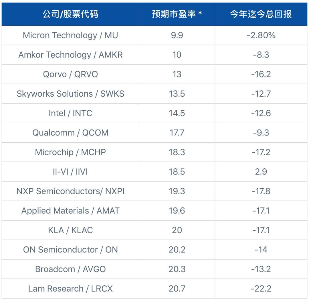 便宜的股票之所以便宜可能是有原因的,而昂贵的股票如果增长前景改善,可能有很多上行空间。近几个月来大盘的回调对芯片类股票不利,拖累费城半导体指数(PHLX Semiconductor Index,简称SOX)在2022年迄今累计下跌约16%。其中跌幅最大的是超威半导体(AMD)和英伟达(NVDA),但痛苦的影响是广泛的。II-VI (IIVI)是SOX指数中唯一一个今年迄今回报为正的成分股。这并不意味着芯片需求下降,恰恰相反,全球供应短缺和供应链中断持续存在,因此芯片库存在市场上遭受重创,尽管市场对它们生产的产品需求强劲。这是一个找到便宜股的机会,自从《巴伦周刊》上次观察到这种现象以来,便宜股的情况只会变得更好。去年12月,我们做了一个筛选,找出了美国SOX指数中以预期市盈率衡量的最便宜的14只股票,整个指数的平均市盈率为30.5倍。此前《巴伦周刊》报道的14只最便宜的芯片股票,今年迄今为止平均下跌了12.7%。* 截至2022年12月29日资料来源: 彭博社这比SOX指数的表现要好,也比最近下跌16%的纳斯达克综合指数要好。II-VI的预期市盈率为18.5倍,是该名单上唯一的赢家,今年迄今的回报率为2.9%,这非常难得了。虽然这不是什么值得庆祝的事,但对爱买便宜股的人来说却是个好消息。在此次回调之后,预计基于2022年每股收益的SOX指数平均预期市盈率已降至27.5倍。下表中是基于最近水平的SOX指数中15只最便宜的芯片股票。