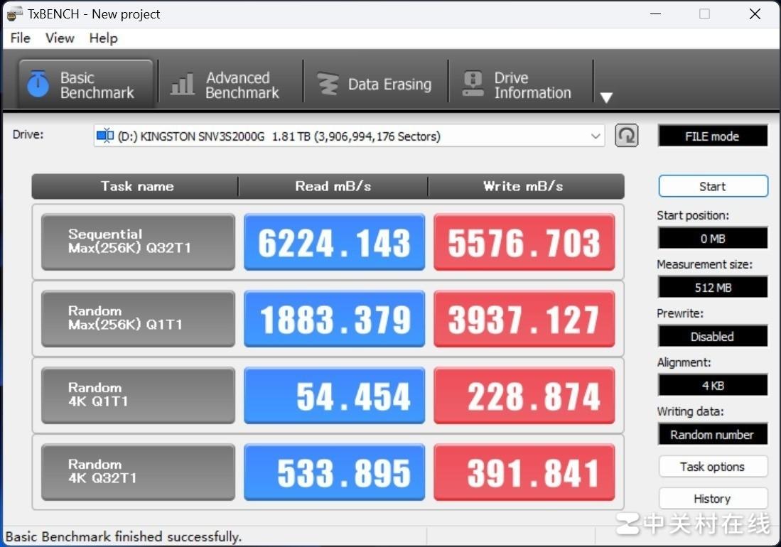 在用于成绩比对的TxBENCH测试中,金士顿NV3 2TB的最高连续读写速度为6224.143MB/s和5576.703MB/s,与Crystal Disk Mark的成绩非常接近,同样超过标称值不少,看来标称的性能有些保守。