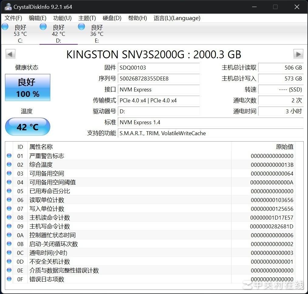 通过Crystal Disk Info的信息,可知金士顿NV3 2TB的标称容量为2000.3GB,采用PCIe4.0x4传输模式,支持NVMe1.4标准,26℃室温下待机温度仅为42℃。