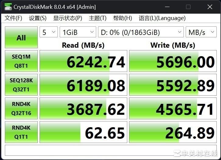 Crystal Disk Mark是存储设备最常用的基准测试软件,通过负载、队列深度和线程直观的展示了固态硬盘的性能。经测试,金士顿NV3 2TB最高连续读写速度为6242.74MB/s和5696MB/s,均超出6000MB/s和5000MB/s的标称值,相对于上代产品NV2性能提升幅度近乎一倍,而随机读写性能分别达到972K IOPS和1169K IOPS。