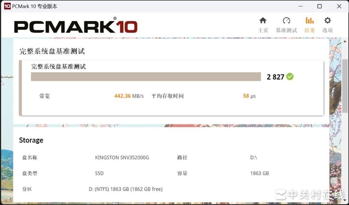 完成了基准测试,下面进入应用模拟测试环节。先进行PCMARK10完整系统盘测试,该项测试通过模拟硬盘当做C盘进行操作系统加载和软件应用,对固态硬盘进行打分。金士顿NV3最终得分为2827分,带宽为442.36MB/s,平均存储时间58μs。