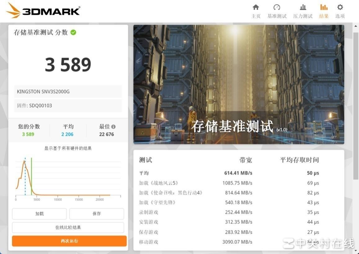接下来使用3DMARK存储测试DLC对金士顿NV3的游戏性能展开测试,该DLC通过对三款游戏的载入、保存、安装与录制来评估固态硬盘的游戏性能,最终金士顿NV32TB固态硬盘的存储基准测试得分为3589分,平均带宽为614.41MB/s,平均存取时间为59us,游戏性能方面还是让人比较满意的。