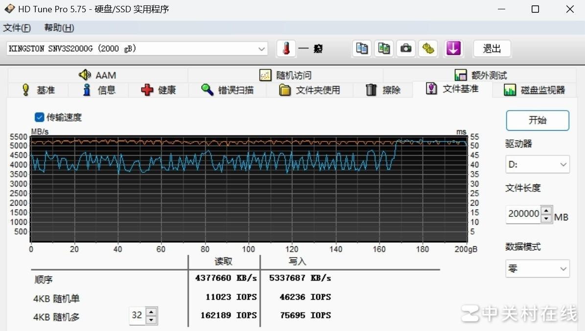 众所周知,SLC缓存是消费存储行业的常用做法,简单来说就是在固态存储的闲置空间划出一部分空间,通过模拟SLC的方式来提升TLC和QLC闪存的性能,因此SLC缓存的容量大小直接决定固态硬盘能全速保存多大的数据。在HD Tune Pro中,我们向金士顿NV3 2TB中写入200GB的数据,写入曲线全程基本在5300MB/s小幅平稳波动,没有出现降速的情况。