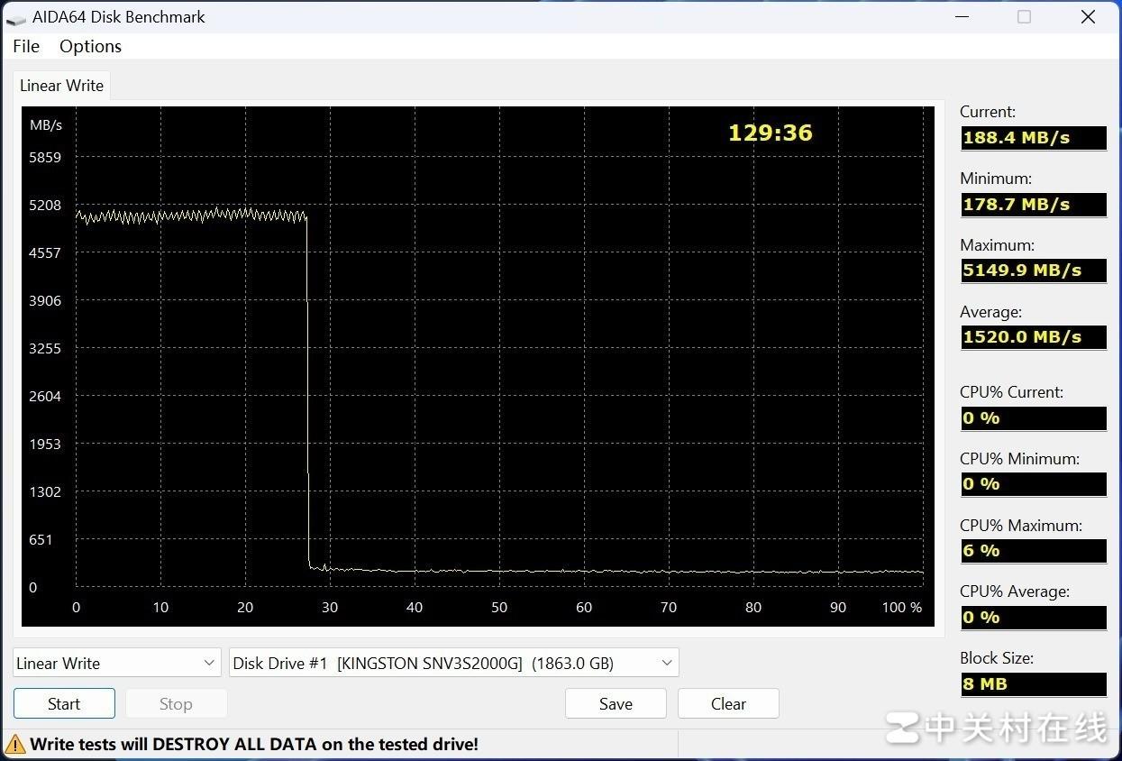 HD Tune Pro测试结果显示SLC缓存显然没有用尽,接下来是最终压榨。在AIDA64的全盘写入测试中,金士顿NV3 初始写入速度在5000MB/s左右,大约27%阶段SLC缓存用尽进入稳态,写入速度达到300MB/s,因此SLC缓存空间大约在540GB左右,意味着玩家拷贝3部《黑神话:悟空》体量的3A游戏也没问题。