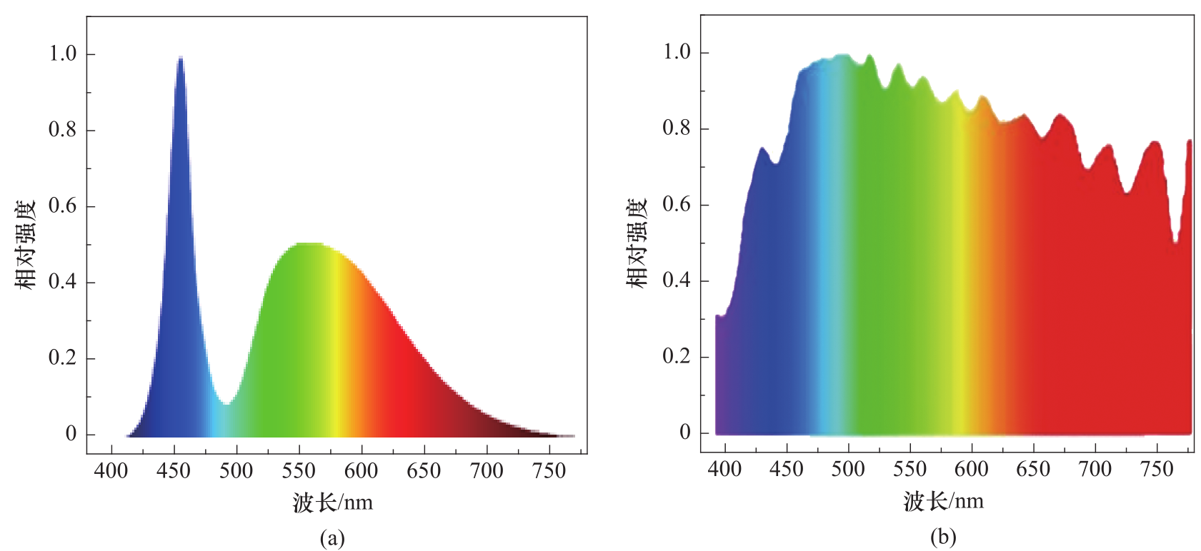图 1 常规 LED 光谱(a)与太阳可见光光谱(b)的比较