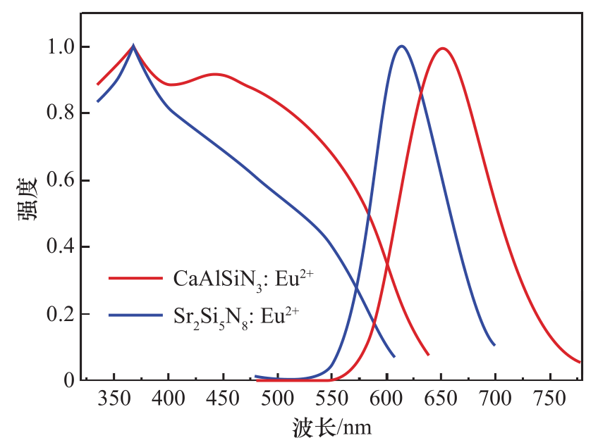 红色荧光粉在白光 LED 器件中起到调节色温、提升显色性的作用。目前,Eu2+ 激活的氮化物包括(Ca, Sr) AlSiN3 : Eu2+ ,(Ca, Sr)2Si5N8 : Eu2+ [32~35],能 被 200~600 nm 宽 谱 激 发, 发 射 峰 值 波 长 为620~670 nm 的宽谱红光(见图 4)。该产品已趋于成熟,其光效和稳定性都较高,基本满足应用需求。