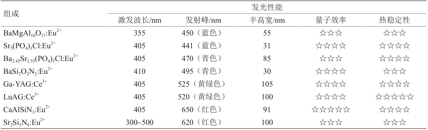 综上,在黄绿色荧光粉中,铝酸盐荧光粉已获得实际应用,硅酸盐和磷酸盐荧光粉的稳定性还有待进一步提高,β-SiAlON:Eu2+ 荧光粉存在半峰宽较窄以及国内制备技术尚未攻克的问题。