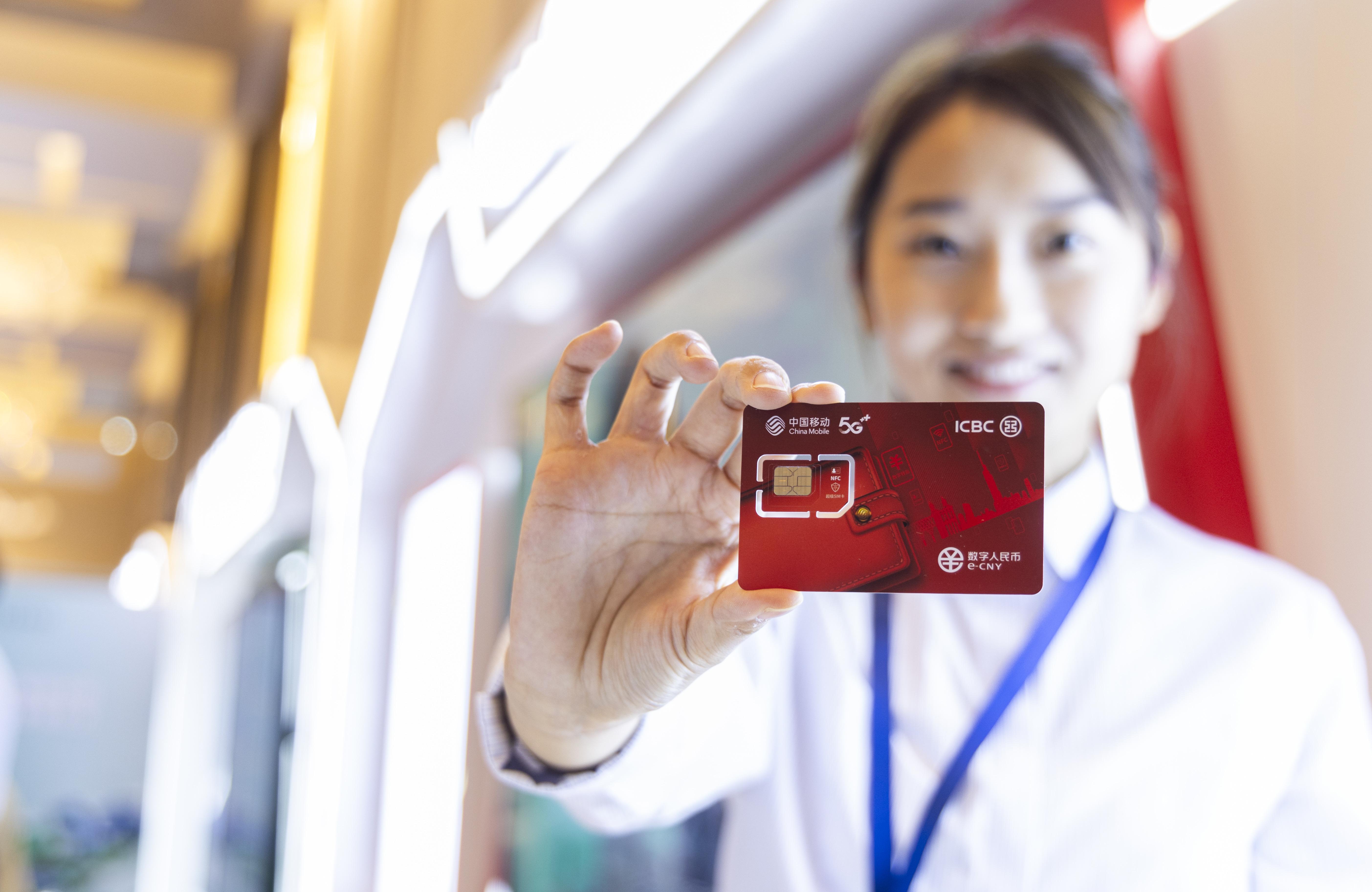 工作人员展示中国工商银行与中国移动合作推出的数字人民币SIM卡“硬钱包”。新京报记者 陶冉 摄