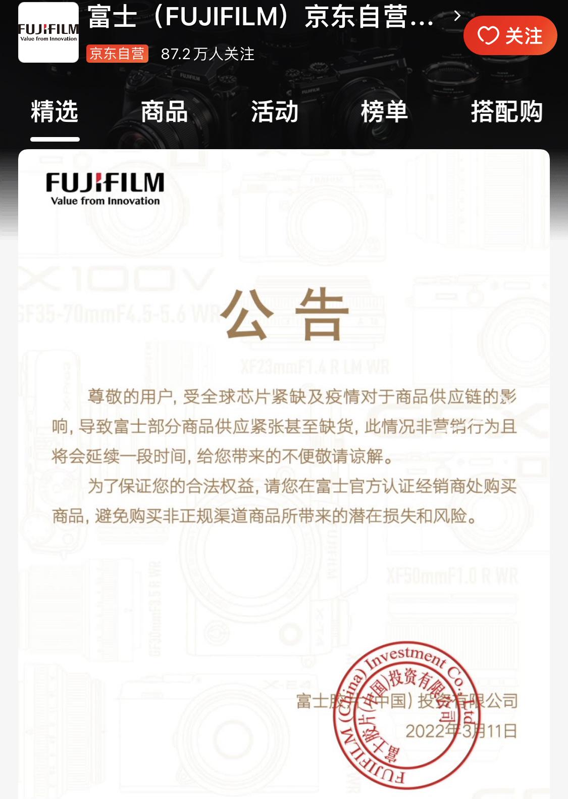 富士相机声明:全球芯片紧缺导致部分商品缺货,非营销行为