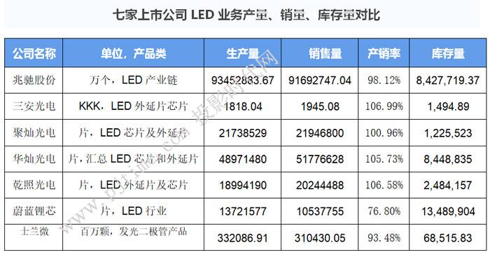 因为本文进行对比分析的七家上市公司都涉及到LED芯片及外延片业务,下面重点分析七家上市公司LED业务版块的营收、销售量、生产量、产能和综合毛利率进行对比分析