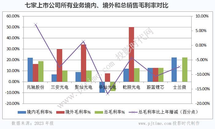 从总营收看,只有蔚蓝锂芯营收出现大幅度同比下降,其他6家均有6%以上同增,其中乾照光电在海信视像控股加持下,业绩大幅增长,成7家之首,增幅达到40.63%。净利上,士兰微和华灿光电出现亏损,三安光电、士兰微、蔚蓝锂芯、华灿光电净利同比减少,聚灿光电净利同比增幅最大达到291.41%。整体看,兆驰股份、聚灿光电、乾照光电三家取得了营收和净利大幅双增长的骄人业绩,只有蔚蓝锂芯营收和净利双降。