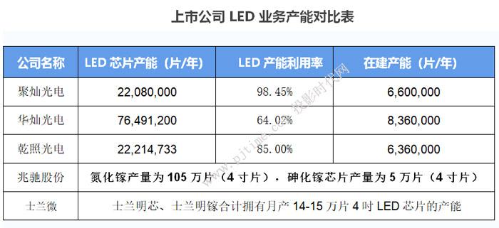 在主营业务为LED芯片及外延片的三家中(占总营收比超过50%),华灿光电、乾照光电和聚灿光电详细披露了产能、产能利用率和在建产能数据,其中华灿光电产能最大为76491200片/年,另有836万片/年的在建产能,乾照光电和聚灿光电产能差不多,约为2200万片/年,且都有600万片/年的在建产能。