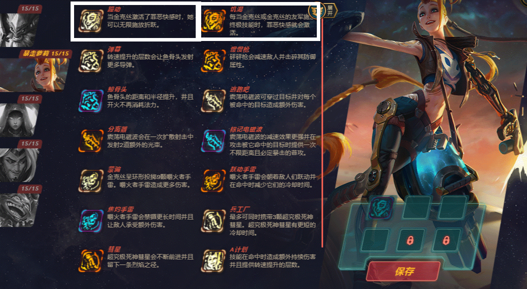 这个则是这个阵容的核心点,AD金克丝,饥渴能让金克丝几乎一直处于被动的罪恶快感中,躁动则能让金克丝被动激活时无限的使用折跃(闪现)