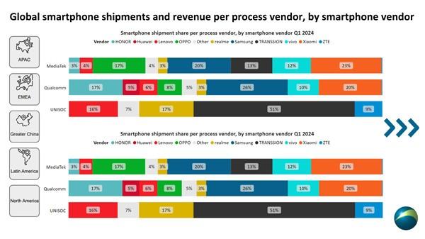 值得注意的是,TOP5品牌中出现了一家中国芯片厂商的身影,那就是紫光展锐。而且它是前五大里面增长最快的,达到64%,出货量2600万颗。究其原因,主要得益于传音在亚太、欧洲、中东非等地区的迅速扩展,目前传音已经连续进入全球手机出货量前五,是隐藏的国产手机巨头,带动了紫光展锐的芯片销量。另外,联想、realme也为紫光展锐贡献了16%、17%的出货量。