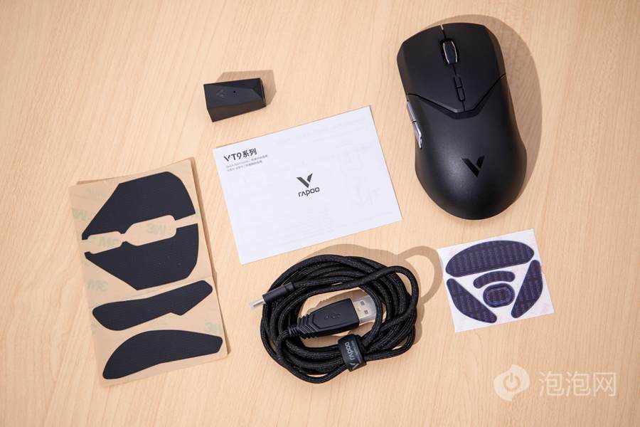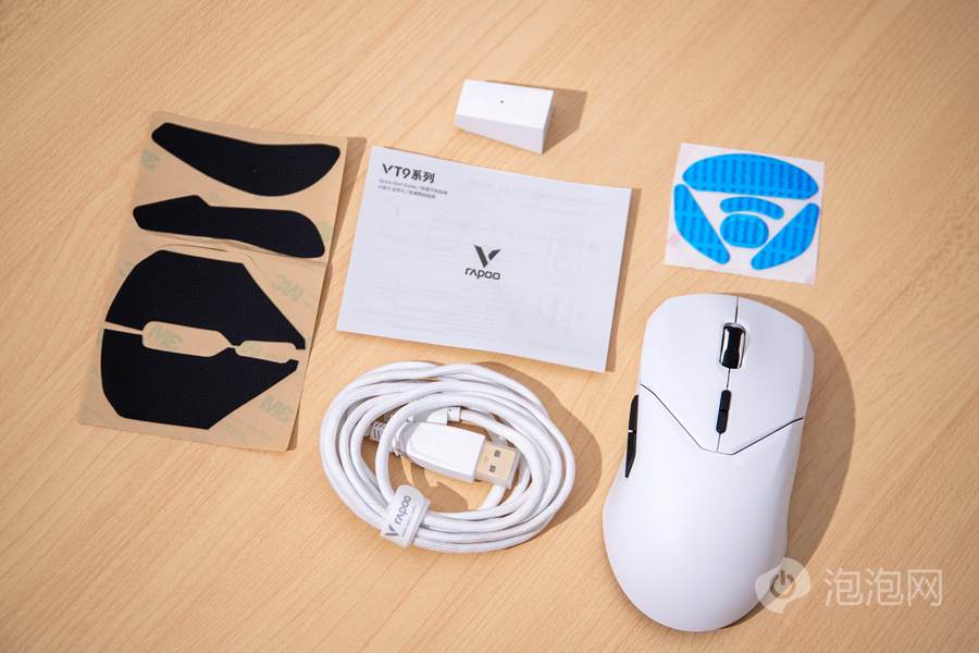 打开包装取出相关的内容,我们可以看到雷柏VT9 Pro双模无线游戏鼠标的本体、说明书、一根1.8M的伞绳USB-C数据线、2.4G无线接收器、USB-C转USB-A的无线接收器延长座、替换的特氟龙脚贴、鼠标侧裙以及主键的防滑贴。从附带的内容来看,其对于用户可能在使用中面临到的需求都有所覆盖,对于用户的使用更为友好,并且相关配件的主体颜色也随着鼠标本体的颜色进行了适配。