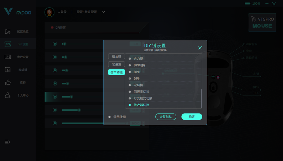除了常规的DPI设置等内容外,雷柏VT9 Pro还可以在RapooGameDev中对按键的功能进行更改,例如用户可以将鼠标底部的DIY按键更改为接收器切换功能,即可在不同的接收器中进行跳转使用。