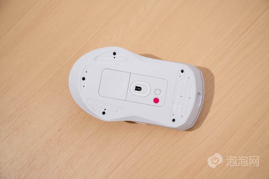 将视角移到鼠标的底部,我们可以看到其在底部配备了几块面积不小的特氟龙脚贴,可以带来更为流畅的操作体验。除此之外,我们可以看到雷柏VT9 Pro双模无线游戏鼠标在底部的拨杆开关以及开关旁边的一颗DIY按键,这一颗DIY按键可以由用户在驱动内进行相关的自定义,配置不同上不同的功能。