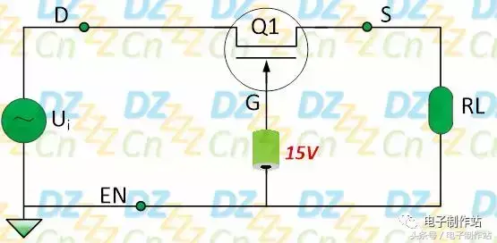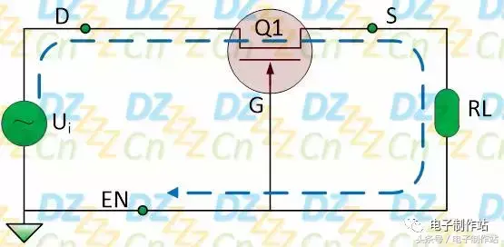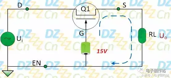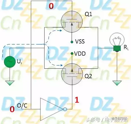 当O/C控制引脚为高电平时,Q1(PMOS)因栅-源电压VGS<VGS(ON)而导通(PMOS的导通阈值为负电压),同样,Q2(NMOS)因栅-源电压VGS>VGS(ON)而导通(NMOS的导通阈值为正电压),如下图所示: