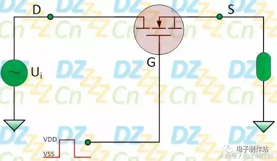 当栅-源电压VGS<VGS(OFF)(栅-源夹断电压,一般在-1V~-10V)时,源极与漏极之间是断开的,如下图所示: