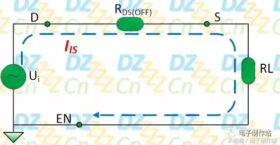 其中,电阻RDS(OFF)表示模拟开关断开时呈现的阻值,应足以达到抑制相邻两个信号链路相互干扰,此时负载RL两端的电压如下式:
