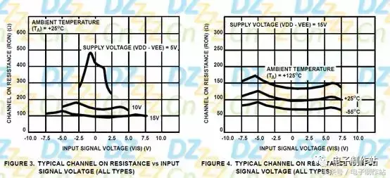 有些数据手册也会给出这个导通电阻的信息,如下图所示:(来自intersil的CD4051数据手册)