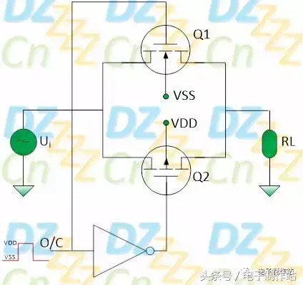 用一对互补MOSFET(即CMOS)即可消除这些缺点,它的结构如下图所示: