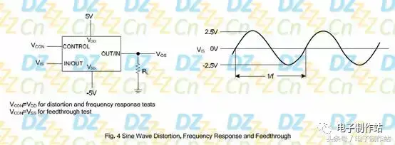 其中,Feedthrough –Switch “OFF”表示在模拟开关阻断状态下的馈通频率,我们看看Fig.4的测试电路图,如下所示: