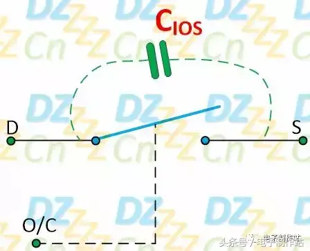 上图已经说了,当VCON=VSS(即模拟开关阻断时)时,电路用来测试馈通(Feedthrough)状态下的频率响应。理论上,在模拟开关阻断状态下,无论有没有输入信号VIS,其相应的输出VOS是不会有输出的,但是MOS管本身是有寄生电容的(如上表中的CIO,也称为CDS,即漏极-源极电容),在关断状态下如果输入信号频率超过一定值,那信号就阻断不了了,它会通过电容CIO以高频耦合的方式通过开关,使得开关呈现导通状态。如下图所示:
