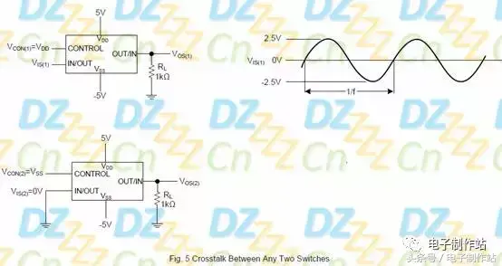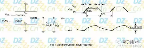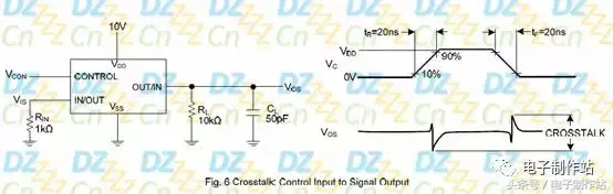 还有一个参数是控制引脚的最大开关频率( Maximum Control Input ) ,一般我们说模拟开关的速度就是指这个参数,而不是上面提到的频率响应的最大值。它的测试电路如下所示: