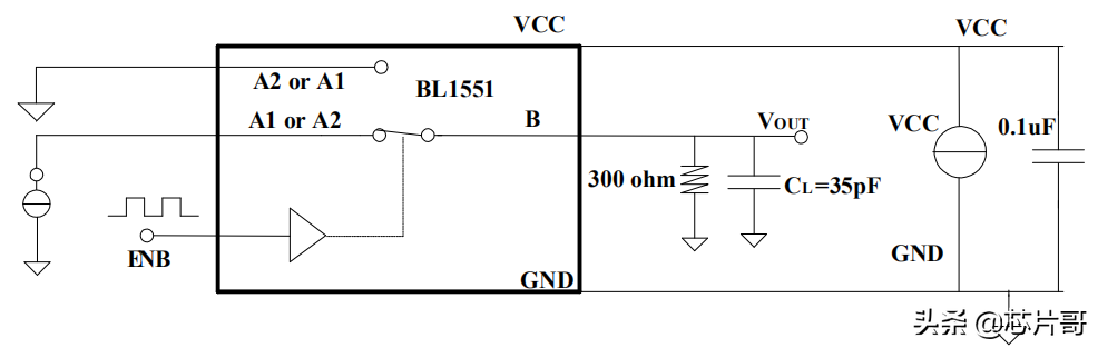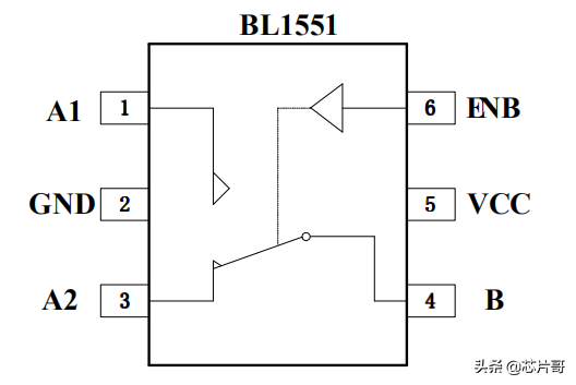 查看芯片内部等效电路图,BL1551模拟开关芯片是实现二选一的模拟信号选择器,其电路功能逻辑