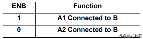 当ENB使能引脚为逻辑高电平,A1信号输出到B引脚,A2信号无法输出;当ENB使能引脚为逻辑低电平,A2信号输出到B引脚,A1信号无法输出;模拟开关功能表