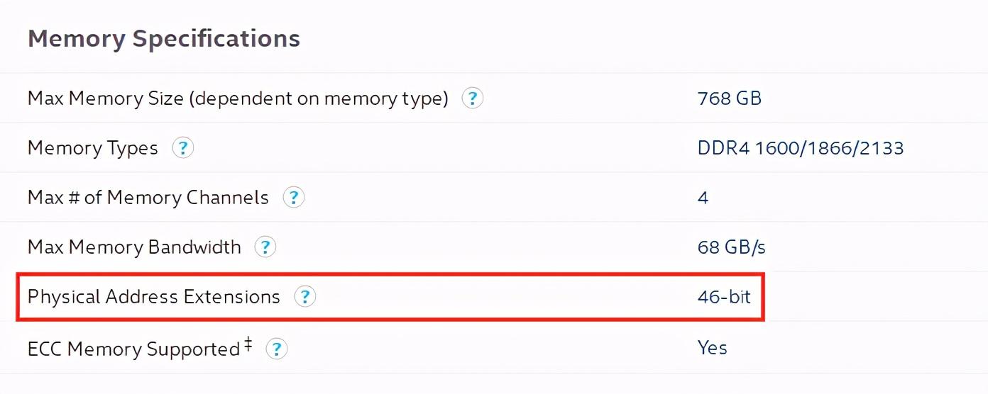 Intel的解释是Physical Address Extensions (PAE) is a feature that allows 32-bit processors to access a physical address space larger than 4 gigabytes.上面图片是Intel Xeon Processor E5-2698 v3的截图,专门就扩展物理地址作了说明,大意就是说这个是为了让32位的处理器能使用超过4GB的内存。这个PAE就是CPU的地址总线位宽,在8086这个16位CPU,它的地址总线位宽是20位,正好能寻址1MB,80286它的PAE是24位,在PentiumII(32位CPU)时这个PAE变成了36位,可以支持64GB的寻址。64位CPU出现之后,其地址总线位宽一般采用的是36位或者40位,它们寻址的物理地址空间为64GB或者1T。