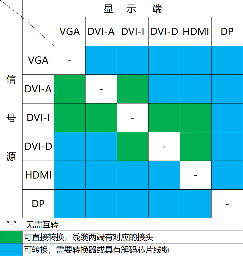 无论是DVI-D或DVI-I或DVI-A转DP,市面上都没有现成的解决方案,无论是民用和专业领域,不过如果是硬核需求,只能两次转换了,也就是DVI-HDMI-DP,理论可行,无此应用场景不多叙述。
