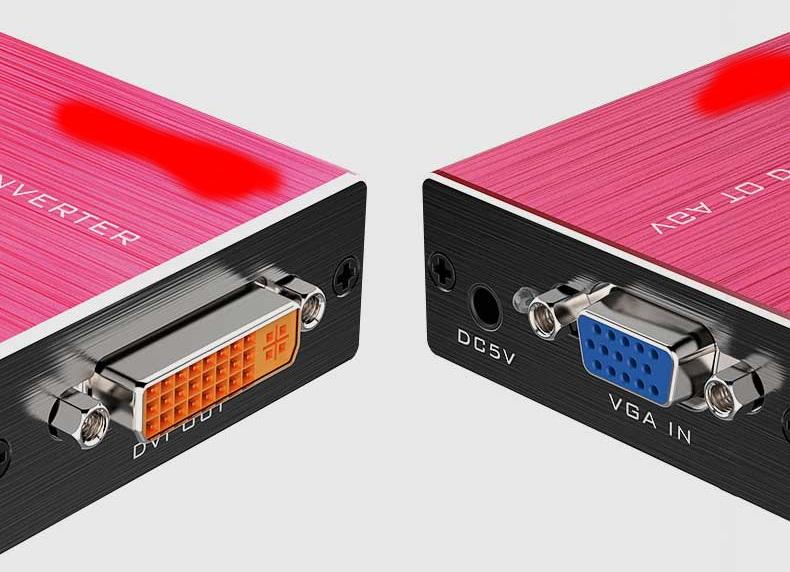 不过我还是找到了VGA转DVI的转换器,就是下图的它,需DC5V额外供电,盒内有解码板,看DVI接口是24+5,因此断定它是支持DVI-A/I/D。