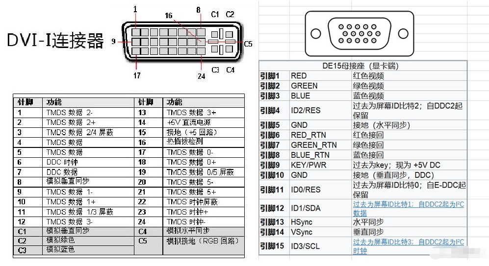 VGA→DVI-A DVI-I(DVI-I兼容DVI-A,此处两者同一而论)