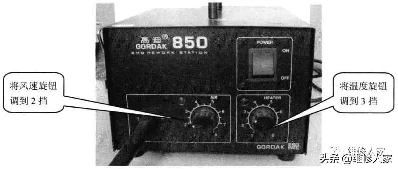 根据实际情况旋转热风焊台的风速和温度挡位,切记温度和风力不宜太大,以免 将芯片或部件烧毁。一般将温度选择在3挡,风力调节在4挡。