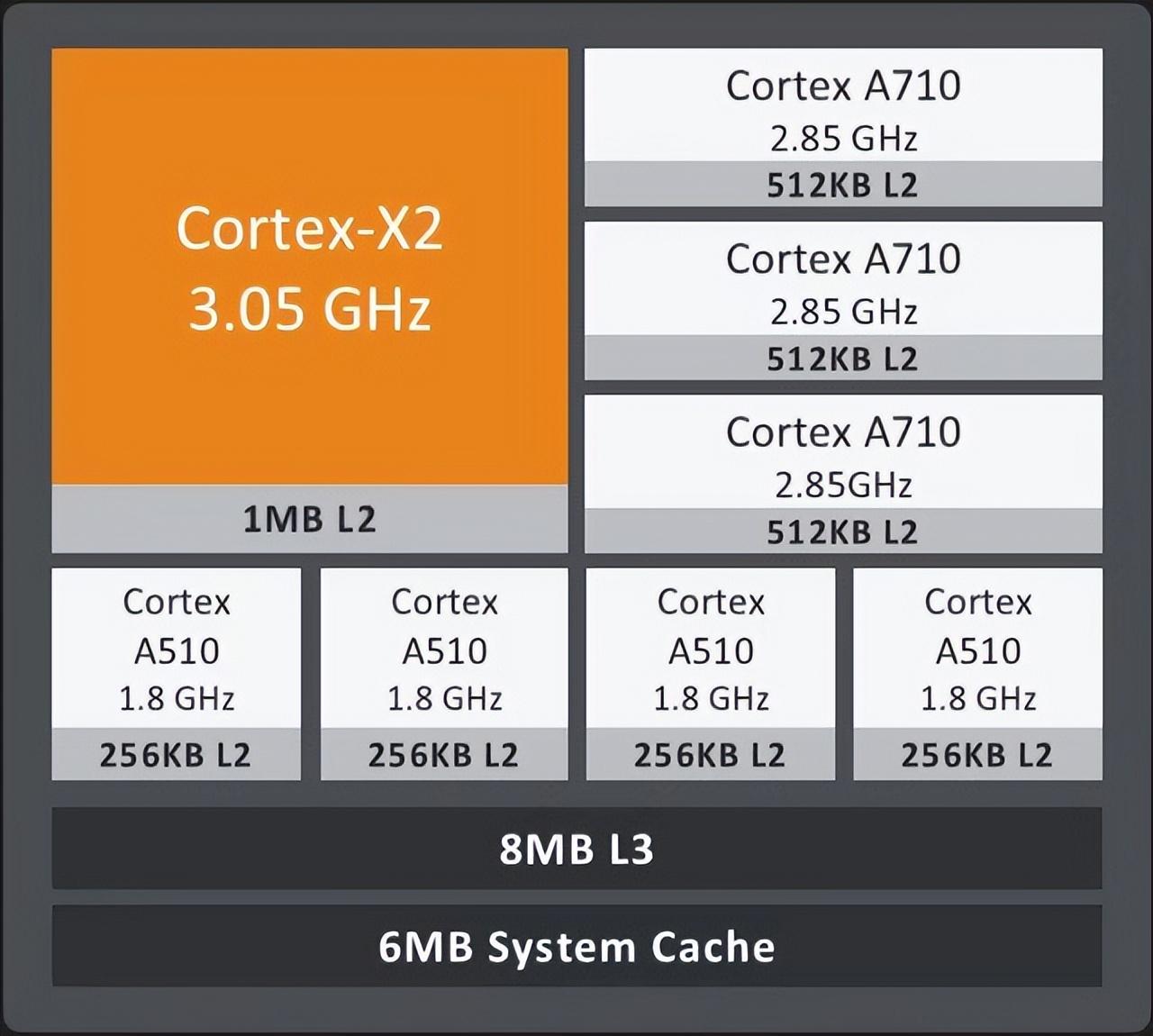 联发科天玑9000处理器采用ARM v9架构,台积电4nm工艺制程,CPU部分均由1颗Cortex-X2超大核+3颗Cortex-A710大核+4颗Cortex-A510小核组成,最高主频3.05GHz,跑分达到了百万级别,性能可以说相当强,已经达到了一颗旗舰处理器应有的水平。