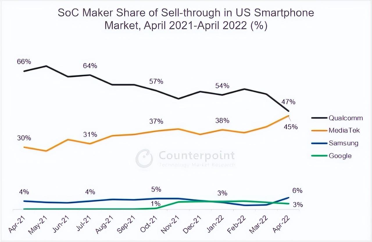 值得一提的是,在今年4月在美国Android智能手机SoC市场销量榜中,高通以47%的份额占据第一,而联发科以45%紧随其后,差距已经缩小至2%。研究总监杰夫·菲尔德哈称,联发科最近公布了Dimensity 1050芯片组,这是其首款支持mmWave的5G芯片组。这颗芯片可以帮助联发科在美国中高端手机市场中获得更多话语权。
